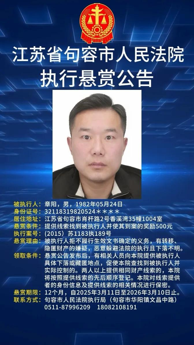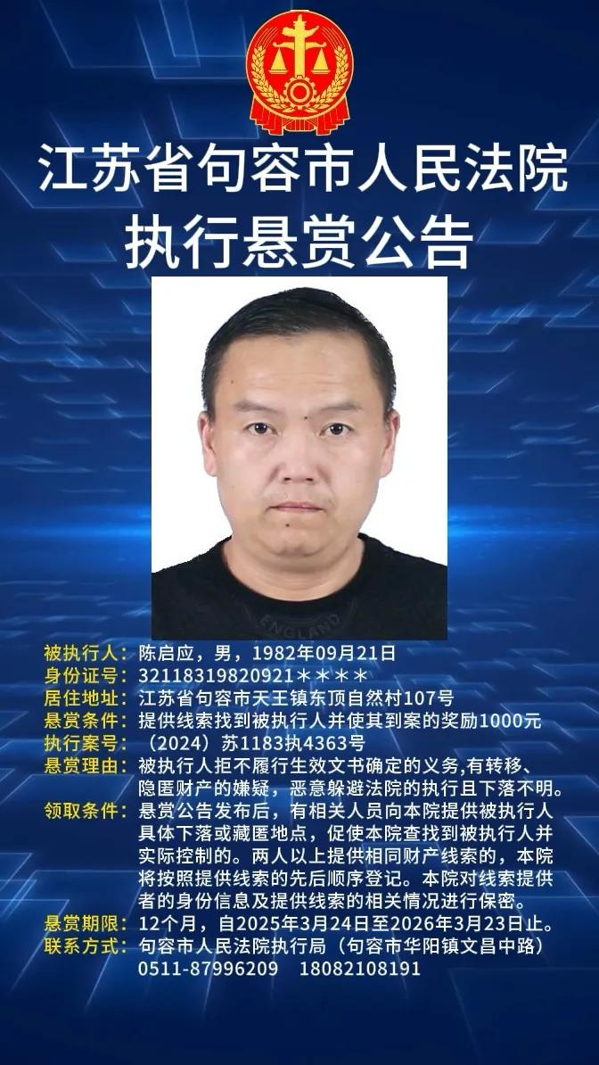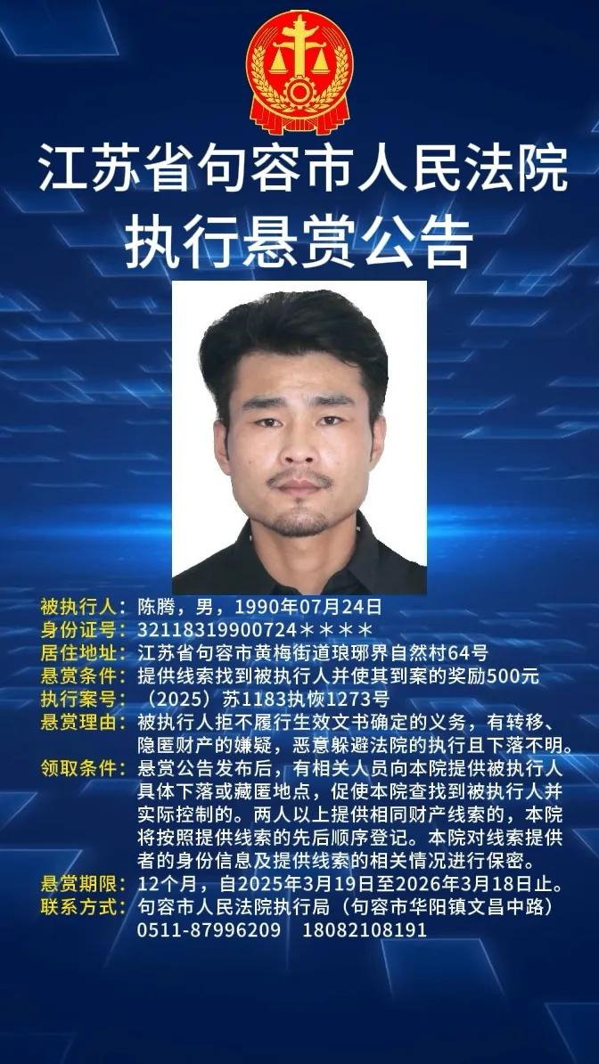 4月21日,江苏省句容市人民法院发布的2025年执行悬赏公告第九期显示,该院一次性就陈腾、章阳、陈启应、叶飞及谢昱函等5人,公开进行悬赏,要求大众发现这5人线索后立即举报。