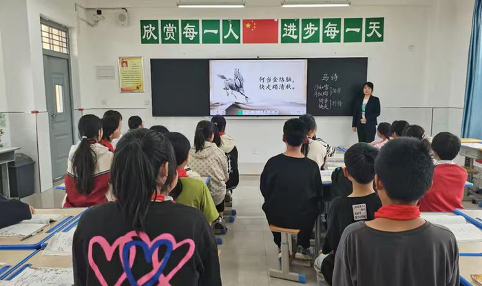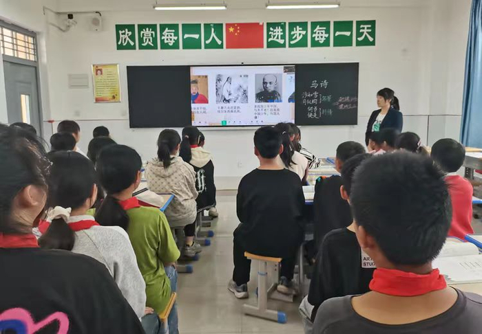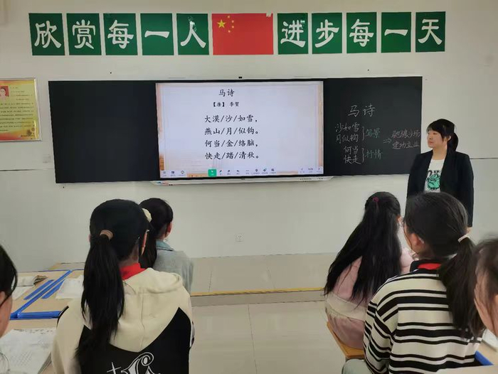 柳丹老师带着孩子们读着《马诗》,以“大漠沙如雪”的意境唤起了孩子们对祖国山河的热爱与眷恋,增强其自身的爱国情怀;体会戍边战士对保家卫国的义无反顾,折服于中华文化的博大精深。