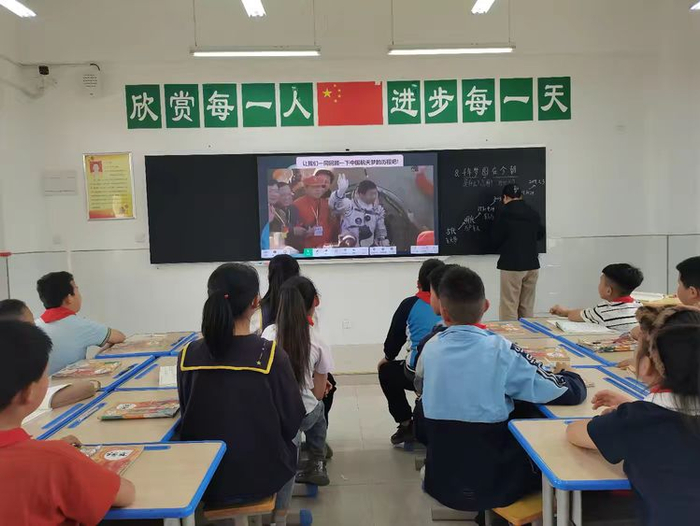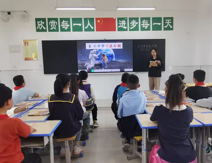 课堂上,吕老师用通俗易懂的语言向学生介绍科技发展日新月异,航天精神代代相传的探索历程,让学生体会到了《千年梦圆在今朝》的来之不易。