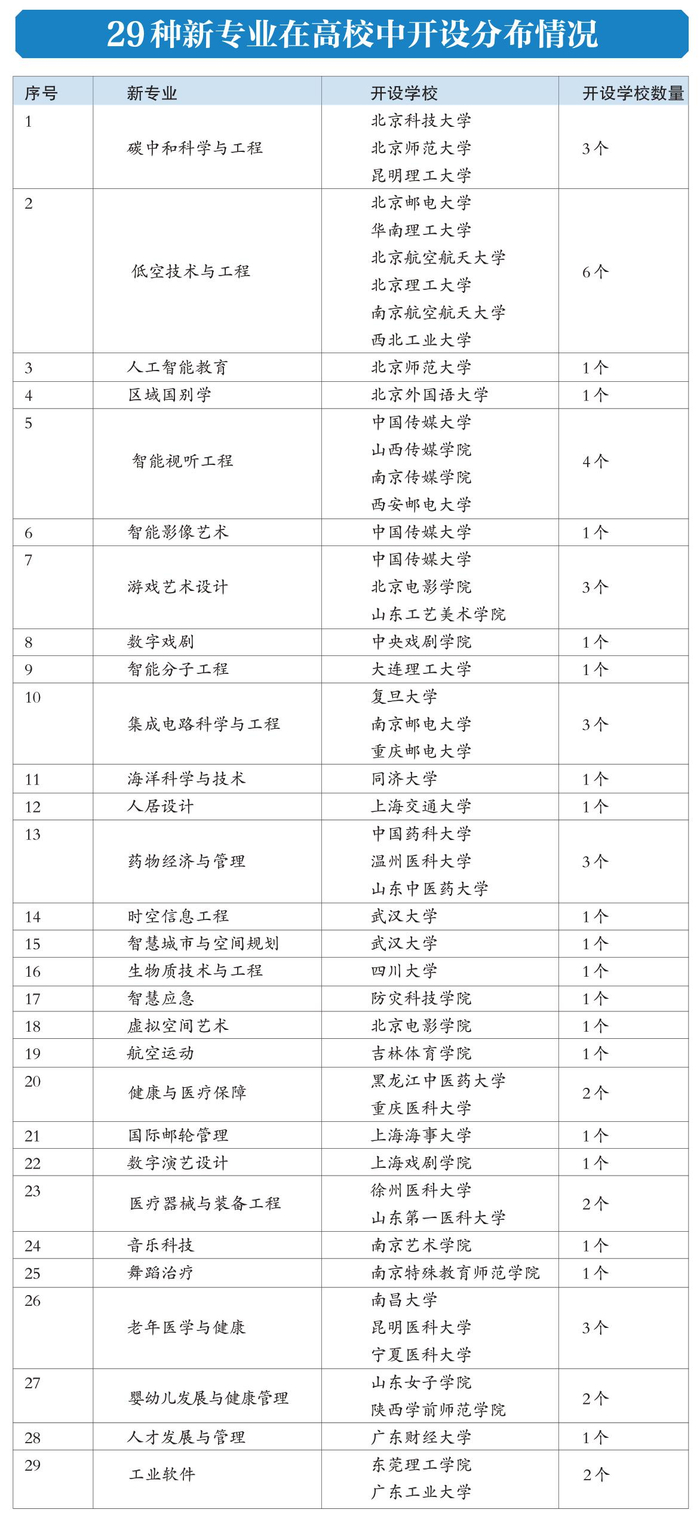 此次增设的29种新专业,充分体现国家战略、市场需求和科技发展牵引,在服务国家战略方面,增设了区域国别学、碳中和科学与工程、海洋科学与技术、健康与医疗保障等专业,面向科技发展前沿,增设了智能分子工程、医疗器械与装备工程、时空信息工程等专业,主动适应市场需求,增设了国际邮轮管理、航空运动、药物经济与管理等专业。同时,聚焦人工智能赋能经济社会发展,增设人工智能教育、智能视听工程、数字戏剧等专业。