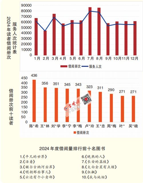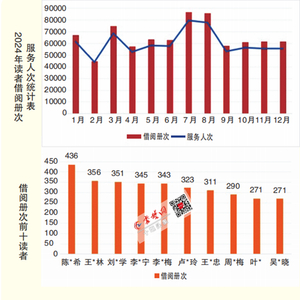 2024年,市图书馆全年借阅书刊78.2万册次、服务读者71.6万人次,较上一年同比分别增长2.3%、1.6%,平均每天入馆人次为1956人次。
