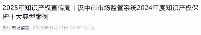 4月21日,汉中市市场监督管理局发布《汉中市市场监管系统2024年度知识产权保护十大典型案例》,详情如下↓↓