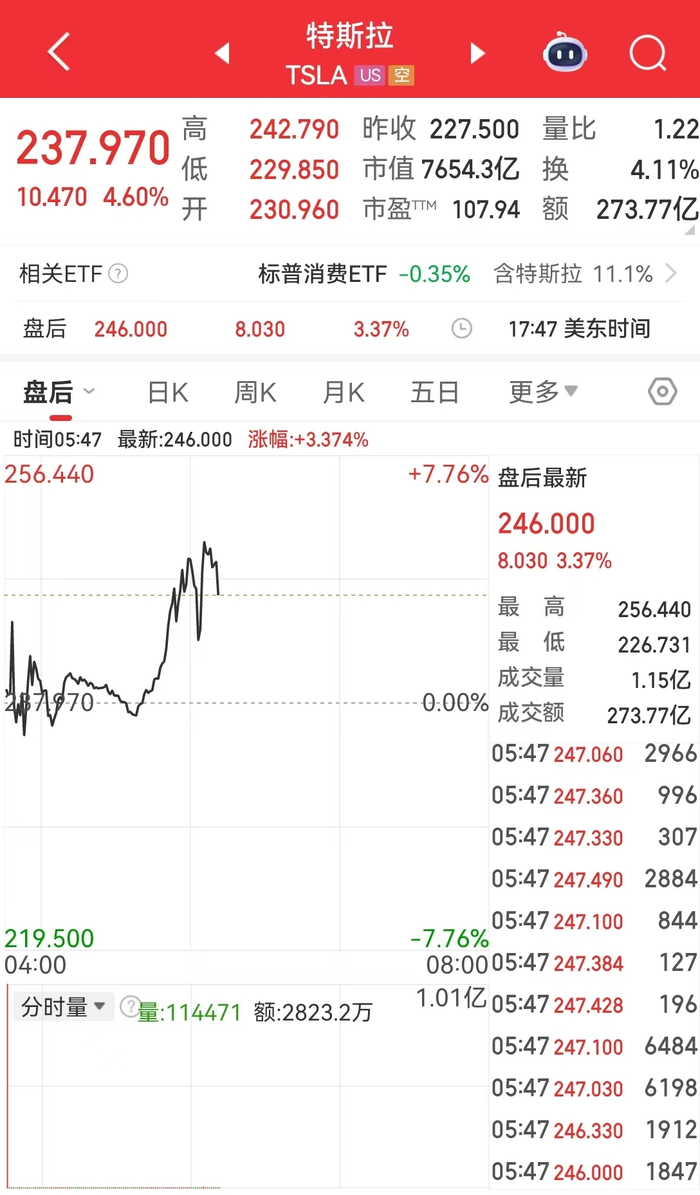 特斯拉收涨4.60%,报237.97美元,市值7654.3.亿美元。其市值一夜增加337亿美元(约合人民币2464亿元)。
