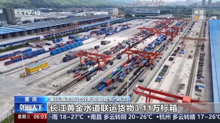 重庆海关统计分析处副处长 刘洁:重庆经西部陆海新通道进出口增长1.4倍,西部陆海新通道与中欧班列、长江黄金水道联运货物3.11万标箱,增长15%。