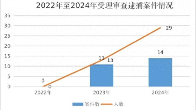 根据《白皮书》,2022年1月1日至2024年12月31日,金山区检察院共受理审查逮捕侵犯知识产权犯罪案件25件42人,受理审查起诉41件146人。同时,提起刑事附带民事诉讼案件5件,反向移送衔接8件,公益诉讼诉前磋商1件。从趋势来看,受理审查逮捕案件及人数逐年递增,受理审查起诉案件及人数则呈缓慢下降趋势。