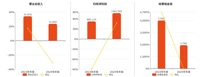 公司营业总收入为14.49亿元。归母净利润为1303.76万元,较去年同报告期归母净利润增加418.65万元,同比较去年同期上涨47.30%。经营活动现金净流入为3.74亿元。