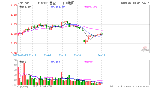 4月23日,A100ETF基金(561880)开盘涨0.30%,报1.002元。A100ETF基金(561880)重仓股方面,贵州茅台开盘涨0.66%,宁德时代涨1.87%,中国平安涨0.38%,招商银行涨0.69%,美的集团涨0.53%,比亚迪涨6.25%,长江电力跌0.17%,兴业银行涨0.33%,紫金矿业跌2.43%,中信证券涨0.60%。