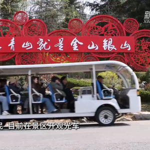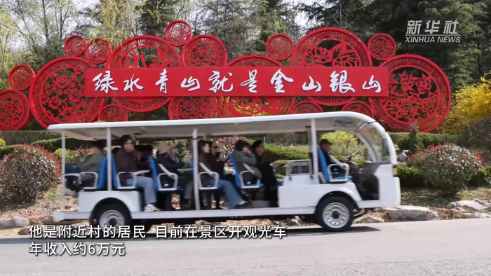 在山东省威海市华夏城景区,周利明正开车载着游客在树林花海间穿行。他是附近村的居民,目前在景区开观光车,年收入约6万元。