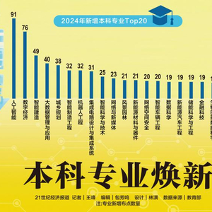21世纪经济报道记者梳理发现,此次增设的29种本科新专业里,工学门类11种、理学门类1种,合计占比41%;此次增设数量排名前20的专业里,工学门类13种、理学门类2种,合计占比75%。