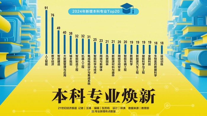 21世纪经济报道记者梳理发现,人工智能专业位居2024年度新增专业点数量之首,共新增91所布点高校,数字经济、智能建造、大数据管理与应用、城乡规划、智能制造工程、机器人工程、集成电路设计与集成系统等新增专业点数量位居其后,布点高校数量都超过30所。