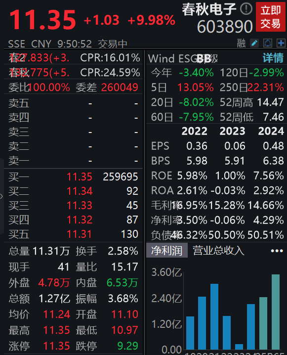 4月23日,春秋电子盘中涨停,报11.35元,成交额1.27亿元。