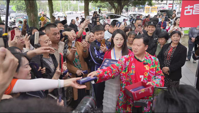 他身着标志性的大花袄,高举荣昌卤鹅,在春熙路拥挤的人群中,奋力挤到“甲亢哥”身旁,用蹩脚的英语高喊:“Speed,Speed,braised goose,eat、eat!”这一幕被记录下来并发布到网络上,迎来了巨大的流量。