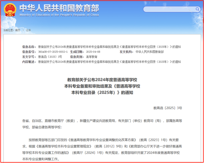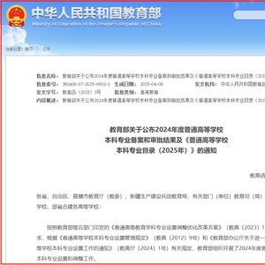 日前,教育部发布了2024年度普通高等学校本科专业备案和审批结果及《普通高等学校本科专业目录(2025年)》的通知。