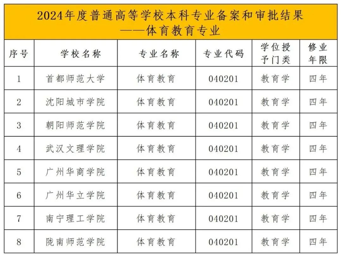 其中,18所高校新增运动训练专业、3所高校新增武术与民族传统体育专业、11所高校新增足球运动专业、8所高校新增体育教育专业,另有多所高校新增体育学类专业。