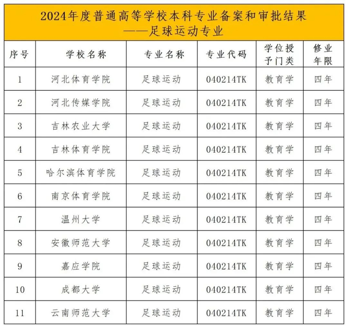 哈尔滨体育学院、南京体育学院、河北体育学院、吉林体育学院等11所高校新增足球运动专业,详见下图。