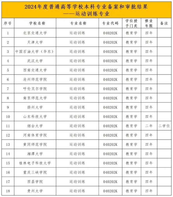 18所高校新增运动训练专业。包含武汉大学、天津大学、北京交通大学、中国石油大学(华东)、南京师范大学、西南交通大学、贵州大学、湘潭大学等双一流院校。值得一提的是,河南体育学院运动训练专业备案和审批通过。