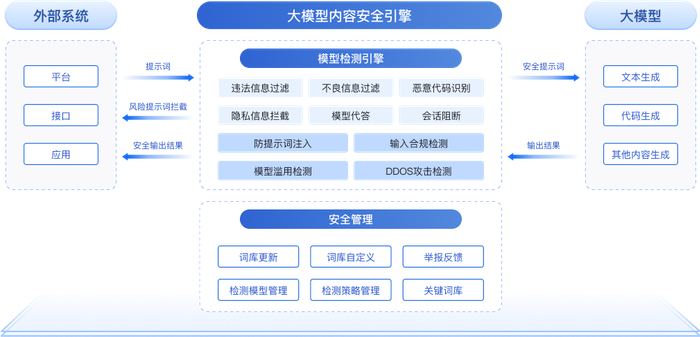 解决方案:内置大模型内容安全引擎,在输入阶段评估提示词,防止生成非法结果;在输出阶段检测违规内容,及时阻断并进行事后审计。支持模型接口代理方式实时检测与阻断,通过三道过滤防线保障内容安全。