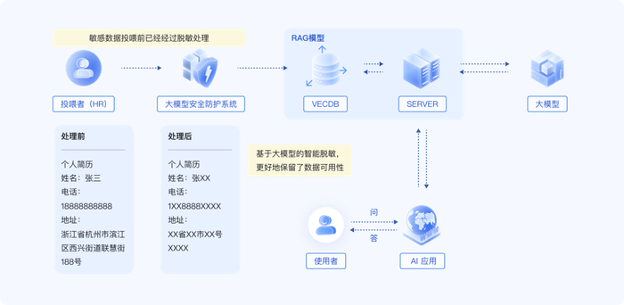 解决方案:在数据输入阶段介入脱密信息处理,使进入 RAG 语料库的资料均为脱敏后材料,基于大模型的智能脱敏在保护敏感信息的同时保留数据可用性。