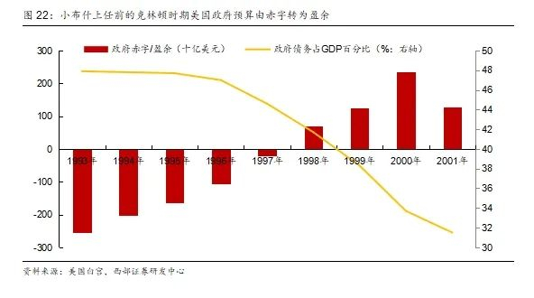 小布什减税的底气源于政府预算盈余。在小布什之前的克林顿政府时期,美国迎来了历史上最长的和平时期经济扩张,其通过签署《综合预算和解法案》大幅提升了国内各税种税率,但也同时也为未来的美国政府带来的充足的税收收入。1998财年,美国联邦预算实现自1969年以来的首次盈余,规模达69.3亿美元,公共债务占GDP比重亦从1993年的47.9%持续降至2000年的33.7%。这种财政健康状态的形成为后续政策调整提供了战略空间。在这一背景下,面对美国互联网泡沫戳破带来经济放缓,且在美联储主席艾伦·格林斯潘(Alan Greenspan)的支持下,布什政府决定运用财政盈余实施战略转型:将预算结余转化为大规模减税政策,以期通过降低边际税率激发企业投资活力,并构建居民消费增长的税收激励基础。这种“盈余转化”策略深刻反映了共和党供给学派的经济哲学,即通过税收工具重塑经济增长动能。