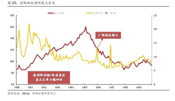 广场协议签署前美元持续强势。减税政策通过双重机制影响汇率水平:一方面,企业税负降低直接改善盈利预期,吸引国际资本流入形成汇率升值压力;另一方面,税收改革带来的经济增长预期会强化货币信用支撑。里根减税政策实施后,叠加美国经济强劲复苏的基本面支撑,美元指数从1980年的85震荡攀升至1985年的160,直至“广场协议”干预后才开启贬值通道。我们认为80年代持续的高利率环境(联邦基金利率长期维持在8%-10%区间)同时与减税政策形成政策协同效应,通过吸引国际套利资金流入,对美元汇率构成显著支撑。这种“税收改革+利率优势”的双重驱动,构成了美元周期的重要特征。