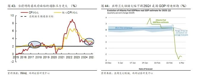 特朗普第一任期初期美国经济处于复苏阶段,当前经济强劲但处于“衰退”叙事。2017年美国仍处于后金融危机时代的复苏期,美国失业率已经从2009年的10%降至4.7%,后续失业率也是持续下降。经济增速方面,2017年美国GDP增速也较为温和,核心PCE通胀率也低于美联储2%的目标。而反观当前,美国经济仍然较为强劲,但在特朗普关税政策影响下也面临新一轮"衰退叙事"。一方面,自2021年11月以来,美国失业率一直处于或低于4.2%,这是自越南战争以来失业率处于低位的最长持续时间,表明劳动力市场充分饱和。另一方面,在特朗普上任进行了一系列关税政策举措后,考虑关税对经济造成冲击影响,亚特兰大联储已将25年一季度的GDP预计增速下调至-2.2%。此外美国通胀粘性超预期,核心PCE持续高于美联储2%的目标,美国经济面临滞胀风险。
