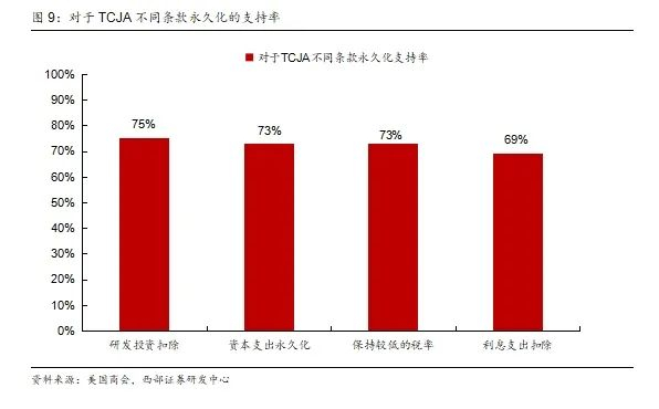 其次,民意变化也影响着减税政策的政治可行性。在第一任期内,不论是偏向共和党还是民主党的人士都比较赞成TCJA推行。而2025年初的调查显示,公众对减税条款永久化的支持进一步上升。这一转变为特朗普第二任期内继续推动减税提供了更坚实的舆论基础。此外民调数据显示,支持永久化研发投资扣除的人数最多,达到参与调查人数的75%。