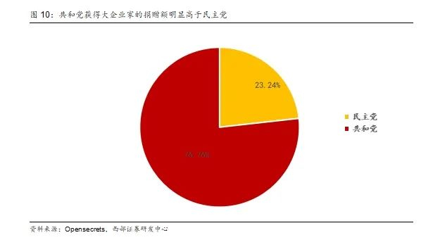 最后,特朗普减税政策的推动离不开其背后的企业和资本支持力量。在第一任期内,TCJA中的企业税和遗产税调整广受大企业与高净值人群欢迎,地产和制造业等行业尤为支持,并通过积极游说推动法案落地。但在疫情后,财政赤字扩大带来不确定性,部分企业界对进一步减税态度转趋谨慎。即便如此,2024年竞选期间,特朗普依然获得不少企业家和投资者支持。根据Opensecrets的统计数据,仅统计政治捐款额处于前100位的个人和组织,其对共和党的政治捐款额占比达76.76%,远高于民主党的23.24%。