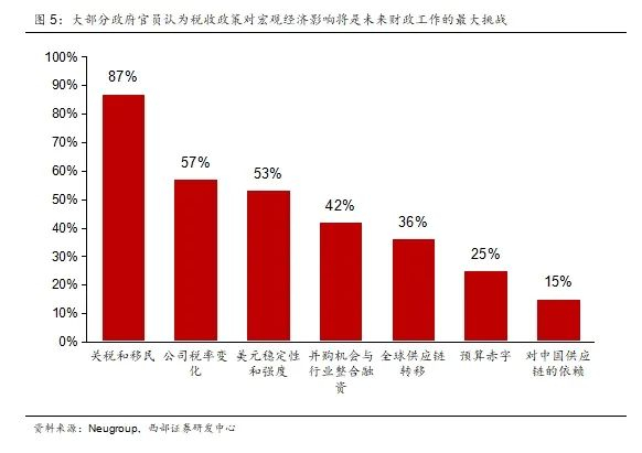 关税和减税政策影响未来美国财政的最大变量。NeuGroup调查数据显示,87%的受访财务官员认为,关税与移民限制所带来的通胀和宏观经济影响将是未来美国财政工作的最大挑战,这直接表明“贸易政策”已经超越其传统职能,成为企业财务与货币决策的首要变量。同时,57%的受访者将企业税率变化与资金回流视为核心关注点,进一步印证了减税政策在重塑资金流向方面的关键作用。我们认为这种“外压内引”的政策并非巧合,而是特朗普政府试图通过一个清晰的激励结构,促使制造业回流,从而实现对中产阶级和“美国制造”复兴的承诺。这种政策联动,不仅体现了特朗普政府对传统自由贸易的挑战,也反映出他试图将财政手段转化为地缘政治工具的治理理念。