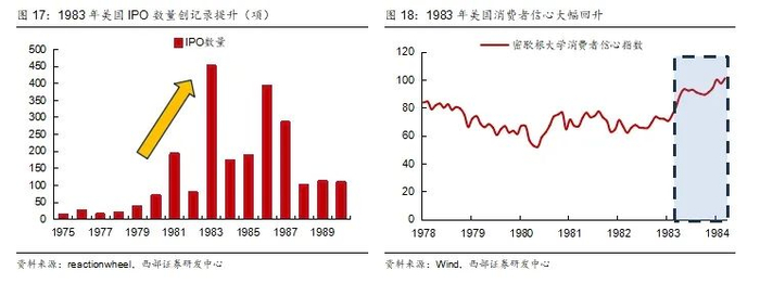 随着货币政策传导机制生效,美国通胀压力持续缓释,经济动能逐步完成从衰退向温和复苏的转换。资本市场率先反映这一趋势,1982-1987年间标普500指数录得220%以上的累计涨幅,启动了一轮超级牛市周期。我们认为本轮复苏的核心驱动力在于里根政府的供给侧改革:个人所得税边际税率下调叠加资本利得税削减,直接推动了居民消费倾向的修复和企业资本支出的扩张。数据显示,密歇根大学消费者信心指数在1983-1984年间实现跃升,从70.4快速攀升至100.1的扩张区间;同期美国IPO融资规模亦创下历史峰值,印证风险偏好的系统性改善。