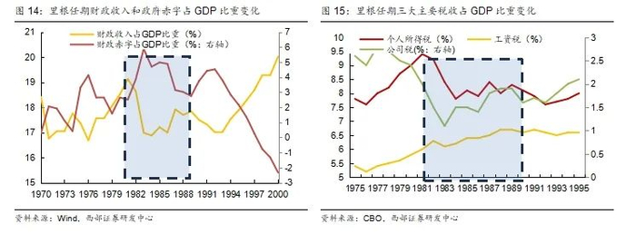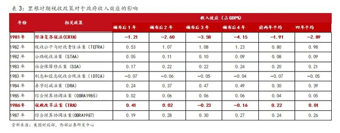 张弛有度,里根政府期间并非一味减税。整体来看,尽管里根任期以1981年和1986年的两次减税方案而闻名,但他在总统任期内也进行了11次加税,包括1982年、1983年、1984年和1987年的大幅加税。根据美国财政部测算,这些增税操作有助于弥补1981年减税造成的收入损失的一半以上。