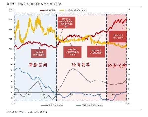 我们认为出现市场表现分化原因主要在于美国宏观环境的不同。ERTA法案实施前,美国经济正深陷长达十年的滞胀泥潭,1980年CPI同比飙升13.5%,创历史峰值。为遏制通胀失控,1979年履新的美联储主席保罗·沃尔克采取激进手段,将联邦基金利率从11%推高至1981年的20%区间,通过刻意制造1981-1982年失业率超10%的经济衰退,成功压制了工资-价格螺旋式上升的恶性循环。在此背景下,美股遭遇系统性重挫,标普500指数于1982年8月12日下探至102.48点的历史低位。值得注意的是,当时供给侧经济学尚未成为主流政策框架,市场缺乏有效分析工具评估大规模减税政策的非线性效应,导致整体预期持续承压。