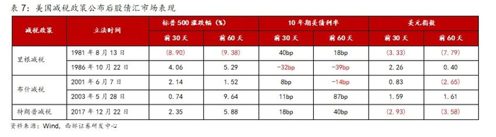 两次法案推出后股票市场表现分化。从里根任期的两次法案推出后(1981年8月13日和1986年10月22日)的美股表现来看,1981年ERTA法案颁布后短期内美股仍持续下跌,其中标普500在前30个交易日下跌8.9%,60个交易日内下跌9.49%。而1986年TRA法案颁布后短期内美股持续提升,其中标普500在前30个交易日上涨4.1%,60个交易日内上涨5.3%。