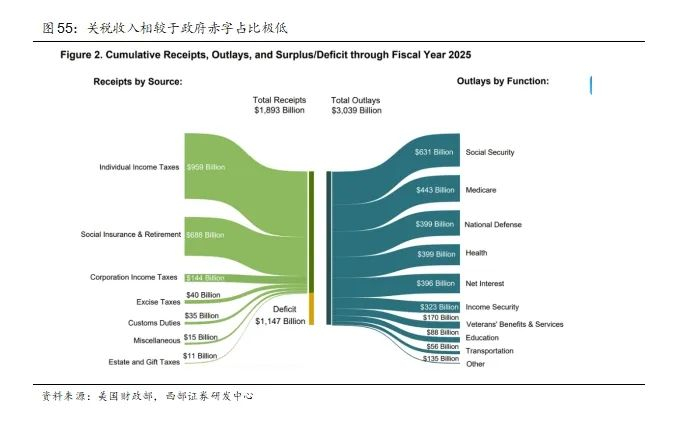其次,税改通过多层次的减税安排,构建了面向不同群体的利益联结网络。在延续中产阶级减税和提升工薪阶层免税覆盖面的同时,政策也涵盖了对高净值人群和退休选民的税收减负诉求,如遗产税、社保福利税的调整。此外,还通过对汽车贷款、家庭护理等领域的定向税收优惠,回应选民对生活成本上升的焦虑。我们认为这种组合型策略不仅保留了民粹减税的政治姿态,也在技术层面实现了对多个选民板块的有效覆盖。此外特朗普提出以关税替代传统直接税,重构国家财政结构。这一思路既是对本土主义经济观的回应,也试图打破现有税收体系对劳动与资本的依赖。但由于关税收入本质上波动性强、稳定性差,且对商品价格有直接传导效应,这一构想面临较大的执行风险,特别是在其可能对中低收入群体造成间接负担的情况下,仍存在较大争议与不确定性。