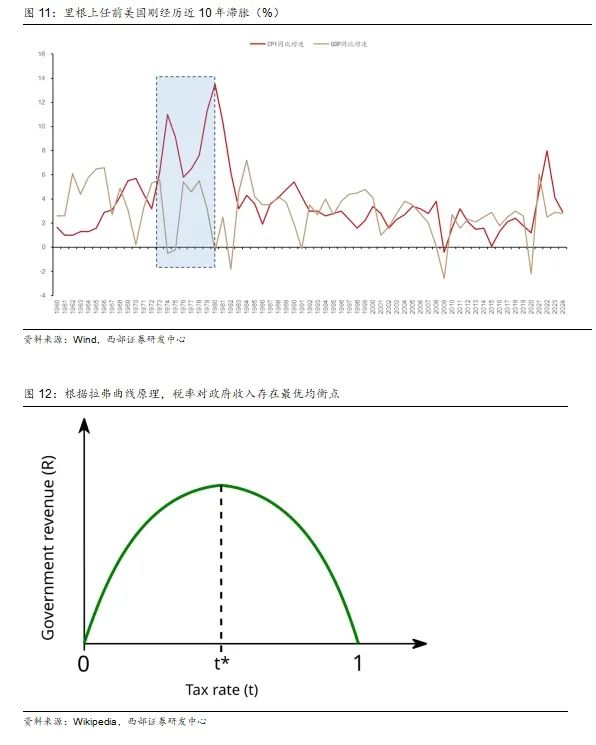 持续10年的滞胀与供给侧经济学的兴起。研究美国的财税历史,里根大减税总是绕不过去的核心话题。在里根上任前,美国经济经历了十年的滞涨(高失业率和持续的高通胀),美国市场普遍对凯恩斯主义经济正统观念以及菲利普斯曲线等实证经济模型的实用性表示怀疑。在这一背景下,里根在1980年竞选演讲时提出了回归自由市场经济的设想,寄希望于通过减税提振供给侧活力而进一步刺激经济。在供给侧经济学观点下,过高的边际税率会打击纳税人的工作积极性,反而会导致税收下降。而适当减税则会产生反馈效应,政府可以通过减税来获得更多税收,这便是著名的拉弗曲线原理。