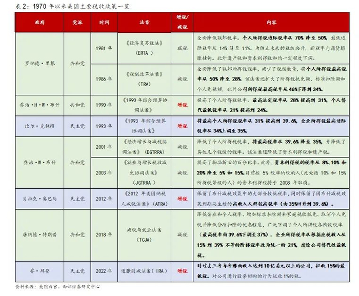 从近50年的美国税率整体变化历程来看,几乎每个政府上台后都会对联邦税率进行改革。其中美国政府推出的减税政策主要聚集在共和党时期,里根任期、小布什任期以及特朗普任期均有较大影响的减税法案提出。但其法案推出时间点的经济和政治背景差异也会对大类资产造成不同程度影响。且不同任期对税种的关注度也不尽相同。