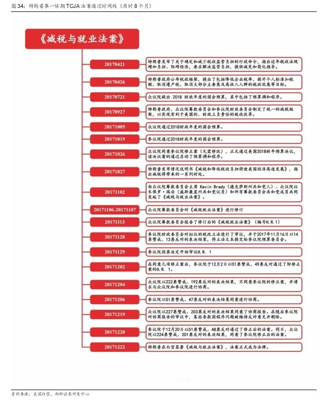 特朗普1.0减税法案历时8个月通过。特朗普第一任期的税改立法以《减税与就业法案》(TCJA)为核心。该法案自2017年4月特朗普全部启动立法程序,到2017年12月22日正式签署成为法律,历经8个月的制度性博弈。作为美国近30年来规模最大税制改革之一,其整个立法过程经历了行政命令发布、政策框架制定、国会预算调和程序,以及众议院和参议院的多轮审议与修订,最终在共和党占多数的国会支持下得以通过。