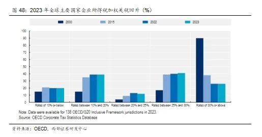 逆风而行?全球主要经济体税率下行放缓为特朗普减税政策提供额外性价比。从国际税收环境演变看,全球主要经济体税收政策正经历趋势性逆转。OECD最新分析显示,受制于后疫情时代各国财政巩固需求与全球税收规则重构的双重压力。2023年实施企业所得税税率上调的辖区数量首次超过下调辖区,终结了自21世纪初开始的全球税率下行周期。数据显示,OECD成员国综合(含联邦与地方政府)企业所得税平均税率从2000年的28.2%持续降至2022年的20.0%,但在2023年出现政策拐点,回升至21.1%。在这一背景下,特朗普政府推行的减税改革虽可能扩大财政赤字压力,但其通过降低企业边际税率形成的税收洼地效应,可以进一步增强美国对跨国资本和产业回流的吸引力。