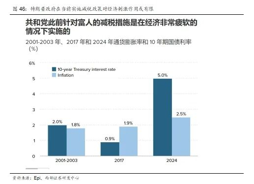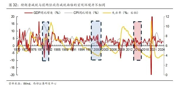 特朗普减税政策目的与此前政府并不相同。复盘过去减税政策推出时候的宏观环境和当前的对比,我们发现特朗普减税与前两轮呈现出显著周期差异与政策目标分化特征。里根政府首轮减税(1981年《经济复苏税法》)推出时,美国经济深陷滞胀泥潭——此前十年CPI年均突破8%,失业率徘徊于5%-9%区间;小布什政府减税(2001年《经济增长与税收减免调和法案》)启动时,正值互联网泡沫破裂后经济衰退期,虽通胀率控制在2%以下,但失业率一度提升至6%。二者共同特征是:政策均诞生于经济收缩阶段,且以下调个人所得税为核心工具来刺激经济回暖(里根削减最高边际税率达25%,小布什进一步降低资本利得税)。