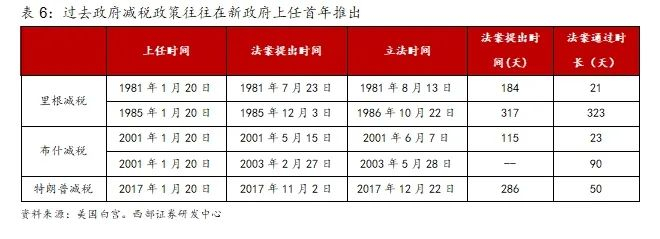 减税政策往往会在新政府上任首年提出。从历史经验来看,总统通常在竞选时期就将减税政策作为核心政治主张进行宣传,并在正式上任后一年内推出具体方案。然而,由于政治博弈态势和经济背景的差异,相关法案在国会的审议周期长短不一。例如,里根在第二任期提出的减税法案,历经国会300多天的反复审议才得以通过。值得注意的是,得益于调和预算法案机制的存在,涉及预算分配的减税政策往往能够突破反对党的阻力,最终获得立法通过。