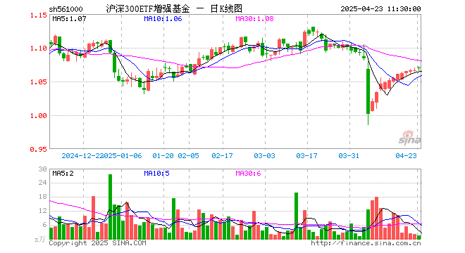4月23日,截止午间收盘,沪深300ETF增强基金(561000)涨0.28%,报1.069元,成交额147.65万元。沪深300ETF增强基金(561000)重仓股方面,贵州茅台截止午盘涨0.13%,宁德时代涨1.35%,中国平安涨0.26%,美的集团涨0.61%,长江电力跌0.38%,五粮液跌0.10%,兴业银行跌0.33%,招商银行涨0.21%,比亚迪涨5.01%,中国石油跌0.12%。