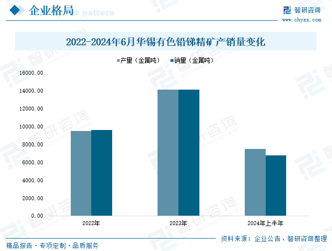 广西华锡有色金属股份有限公司承接原华锡集团的核心资产及业务,前身为大厂矿务局,成立于1952年,是广西唯一国有有色金属行业上市公司,股票简称“华锡有色”。华锡有色主营业务为有色金属勘探、开采、选矿业务,主要产品为锡、锌、铅锑精矿,并通过委外加工模式生产锡、锌锭,同时涉足工程监理业务。2024年上半年,华锡有色铅锑精矿产量为7484.89金属吨,同比上升11.15%;铅锑精矿销量为6734.3金属吨,同比增长11.02%。