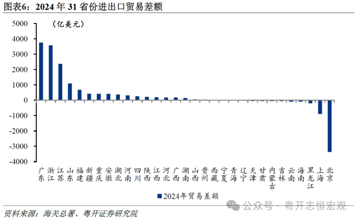 第二,从贸易差额看,广东、浙江、江苏三个东部出口大省对我国贸易顺差的贡献突出,合计占全国的97.9%;逆差较大的省份主要是北京、上海。2024年,全国有21省份进出口为顺差;其中广东、浙江、江苏的贸易顺差规模最大,分别为3753亿美元、3580亿美元、2372亿美元,贸易顺差合计占全国97.9%,三个省份是我国贸易顺差的最主要来源地;北京、上海、黑龙江等10个省份为逆差。其中逆差较大的省份主要是北京、上海,2024年逆差分别达3368亿美元、890亿美元。还有黑龙江、云南、内蒙古等一些边疆省份为逆差,与当地产业竞争力不强、出口商品规模有限有关。
