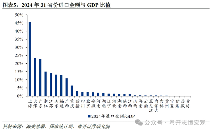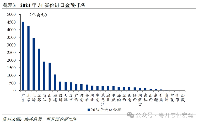 进口金额方面,出口大省的进口规模排名同样靠前,进口能源品、消费品等丰富了国内生产供给。2024年,广东、北京进口金额分别达4526、4220亿美元,分列全国前两位;其中广东进口电子元件、机械设备零部件为主,北京进口矿物燃料、奢侈品较多。北京作为央企总部和金融中心,石油等矿物燃料的进口贸易数据多归集于此,如中石油、中石化、中海油等;同时,作为高消费城市和奢侈品交易枢纽,黄金等高端商品的进口需求旺盛。上海、江苏、浙江、山东、福建进口金额均超过1000亿美元。从进口金额/GDP看,2024年上海、天津、广东进口依存度最高,分别达到45.5%、23.4%和22.7%。其中,上海进口依存度显著高于其他省份,源于我国芯片与高端设备主要通过上海口岸,以及外高桥保税区中奢侈品、医药品等商品进口规模较大。