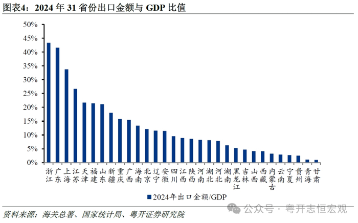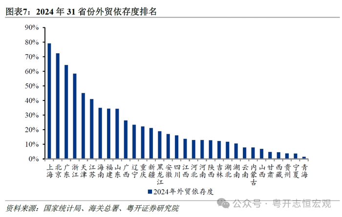 3、从外贸依存度看,广东、浙江、江苏等经济大省外贸依存度较高,受到外需影响较大。