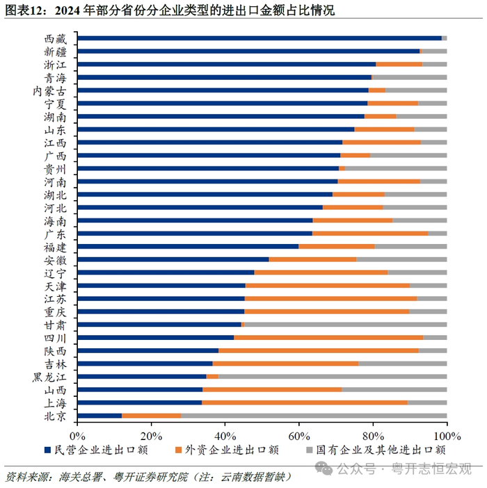 从民企看,多数经济大省外贸进出口以民企为主。全国层面,民营企业占进出口总额的“半壁江山”,2024年,全国民营企业进出口24.33万亿元,增长8.8%,占我国外贸总额的比重提升至55.5%。省份层面,多数省份民企占进出口总额比重超过一半。西藏、新疆外贸规模体量较小,民企占进出口总额的比重超过90%。主要经济大省民营企业占比超过一半,浙江、湖南、山东、河南、广东、福建民营企业进出口占比分别高达80.8%、77.7%、75.0%、70.5%、64.6%、59.9%。