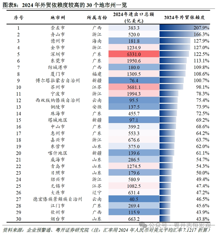 第三,从外贸依存度看,广东、浙江、江苏等经济大省外贸依存度较高,受到外需影响较大。从外贸依存度(进出口总额/GDP)看,全国前九名被中东部省份包揽。2024年,上海、北京外贸依存度超过70%,排名前两位;经济大省中,广东、浙江、江苏、福建、山东外贸依存度分别达64.3%、58.4%、41.0%、34.4%、34.3%,均高于全国平均水平(32.5%),外贸依存较高的省份受外需影响较大。从城市来看,2024年,全国有8个地级市(副省级城市)外贸依存度超过100%,分别是崇左、舟山、儋州、金华、深圳、东莞、防城港、厦门。