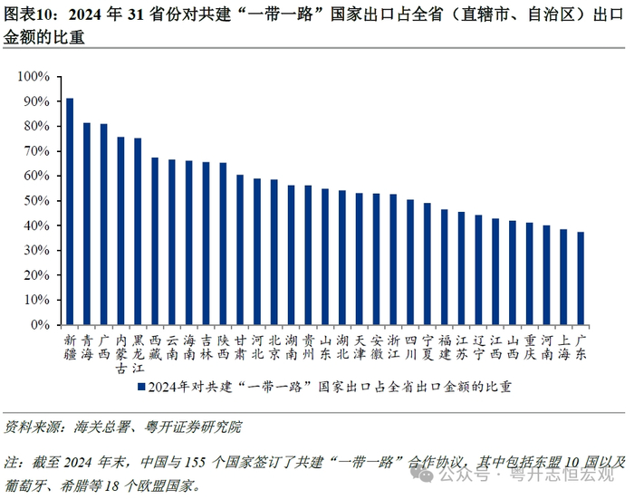 第四,从出口区域看,中东部省份对美欧发达市场的出口份额较高,西部省份对共建“一带一路”国家和地区的出口份额较高。近年来,中国外贸企业积极开拓海外市场,出口地区更加趋于多元化。2024年,美国是广东、江苏、河南、山西4个省份的第一大出口市场;而随着中欧班列稳定开行、运输效率不断提升,欧盟已经成为浙江、上海、安徽等8个省份的第一大出口市场。同时,中国持续扩大对外开放,共建“一带一路”倡议推动对新兴市场的出口增长。从全国看,2024年,中国已与155个国家签订了共建“一带一路”合作协议,中国对共建“一带一路”国家出口金额达17158.6亿美元,同比增长9.6%,占全部出口的48.0%;其中,对东盟10国出口金额5865.2亿美元,同比增长12.0%,东盟成为中国出口的第一大市场。从各省份出口结构看,对共建“一带一路”国家出口份额排名靠前的都是西部省份,2024年,新疆、青海、广西出口金额分别有91.2%、81.3%、80.9%是对共建“一带一路”国家的出口。