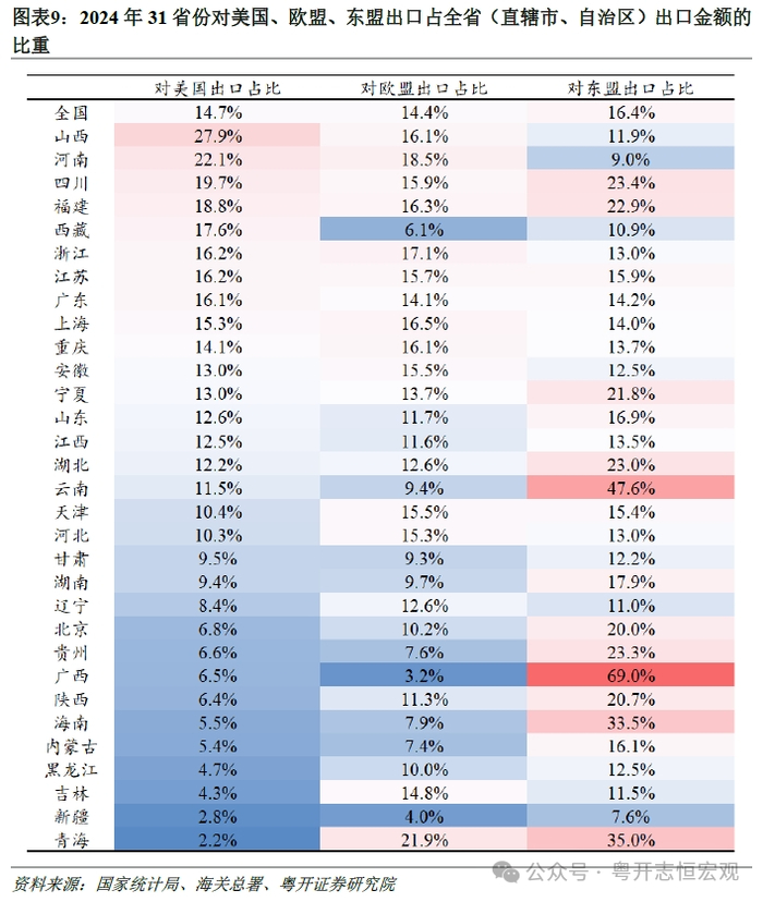 第五,从出口商品看,机电产品是多数省份的主要出口产品,江苏、广东机电产品出口规模及占比较高,浙江、福建劳动密集型产品出口占比超过四分之一。2024年,机电产品出口约占全国出口的59.4%。分省份看,重庆、陕西的机电产品占全省(直辖市)出口金额的份额超80%,位居全国前两位;经济大省中,四川、江苏、上海、广东、河南机电产品出口份额分别达74.9%、68.7%、68.1%、65.6%、63.6%,均高于全国平均水平;其中重庆的笔记本电脑、四川的平板电脑、河南的智能手机出口金额全国领先。新商品方面,以电动汽车、锂离子蓄电池、光伏产品“新三样”为代表的产品出口需求旺盛,是稳外贸的重要抓手。2024年,山西、河北、内蒙古、河南“新三样”产品出口分别增长199.4%、77.6%、45.3%、21.6%;近年来青海的光伏产品、陕西的电动汽车、福建的锂离子蓄电池出口快速增长,上述三省2024年“新三样”产品出口占全省出口金额的份额分别达18.2%、13.7%、10.3%。传统商品方面,浙江、福建、山东等省份在劳动密集型产品具备比较优势。2024年,浙江、福建、山东劳动密集型产品出口占全省出口金额的份额分别达30.4%、27.3%、18.7%;浙江和山东纺织服装出口分别占全省出口的16.8%和10.2%。
