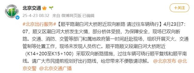 4月23日7:07,顺义区潮白河大桥发生火情,部分桥体受损,为保障安全,现场已双向断路。交通、消防、交管等部门和属地政府第一时间赶赴现场,组织开展灭火、交通管制等处置工作,现场未发现人员伤亡。顺平路顺义段潮白河大桥附近(K14+200至K15+100)采取双向断路措施,过往车辆可绕行顺平复线和顺平南线。请广大市民提前规划好出行路线,给您带来不便敬请谅解。