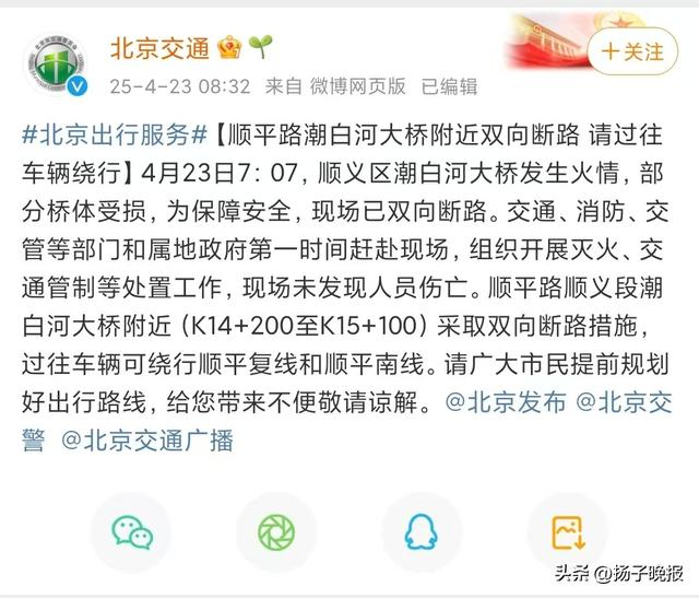 据北京交通通报,4月23日7:07,顺义区潮白河大桥发生火情,部分桥体受损,为保障安全,现场已双向断路。交通、消防、交管等部门和属地政府第一时间赶赴现场,组织开展灭火、交通管制等处置工作,现场未发现人员伤亡。顺平路顺义段潮白河大桥附近(K14+200至K15+100)采取双向断路措施,过往车辆可绕行顺平复线和顺平南线。请广大市民提前规划好出行路线,给您带来不便敬请谅解。